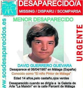 Le lundi 6 avril 1987, David GUERRERO GUEVARA, surnommé « el niño pintor », a disparu l’âge de 13 ans alors qu’il se rendait à une galerie d’art de Málaga pour une entrevue concernant une exposition de ses tableaux. Il a quitté son domicile en direction de l’arrêt de bus et n’a jamais été revu.